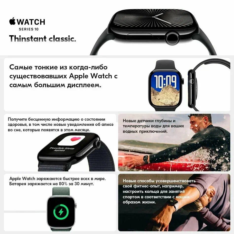 Apple Watch S10 42 Silver Blue Cloud SL MWWD3 имеют класс водонепроницаемости WR50 (5 атм), что позволяет использовать их в повседневной жизни и при занятиях спортом.