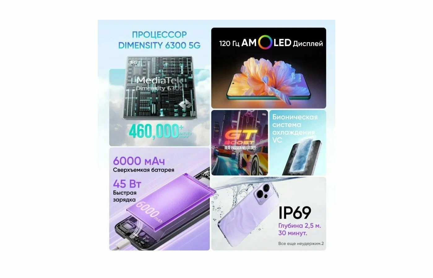 Смартфон realme 14T 5G 12/256Gb Purple — это современное устройство, которое сочетает в себе передовые технологии и стильный дизайн.