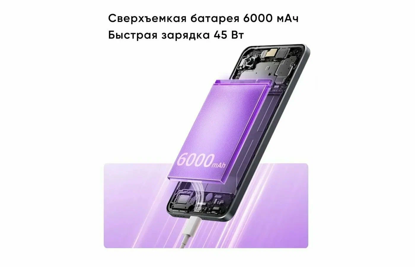 Смартфон realme 14T 5G оснащен аккумулятором емкостью 6000 мАч, что обеспечивает длительное время работы устройства. Время работы в режиме ожидания составляет 547 часов, а время заряда — всего 30 минут до 50%.