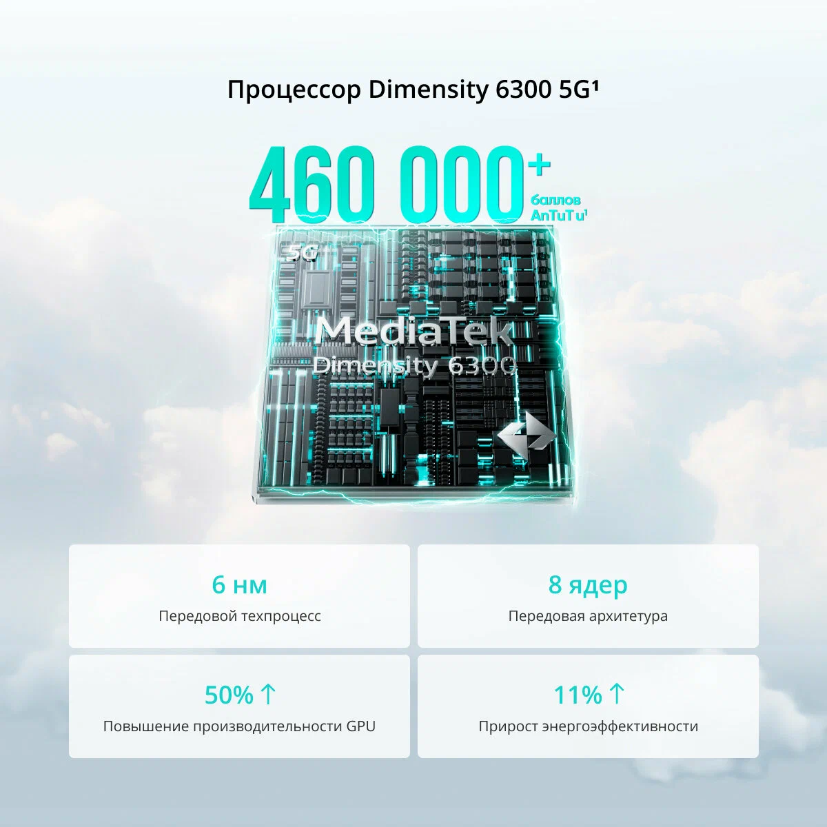 • Sильный процессор Dimensity 6300: баланс между мощностью и энергоэффективностью.