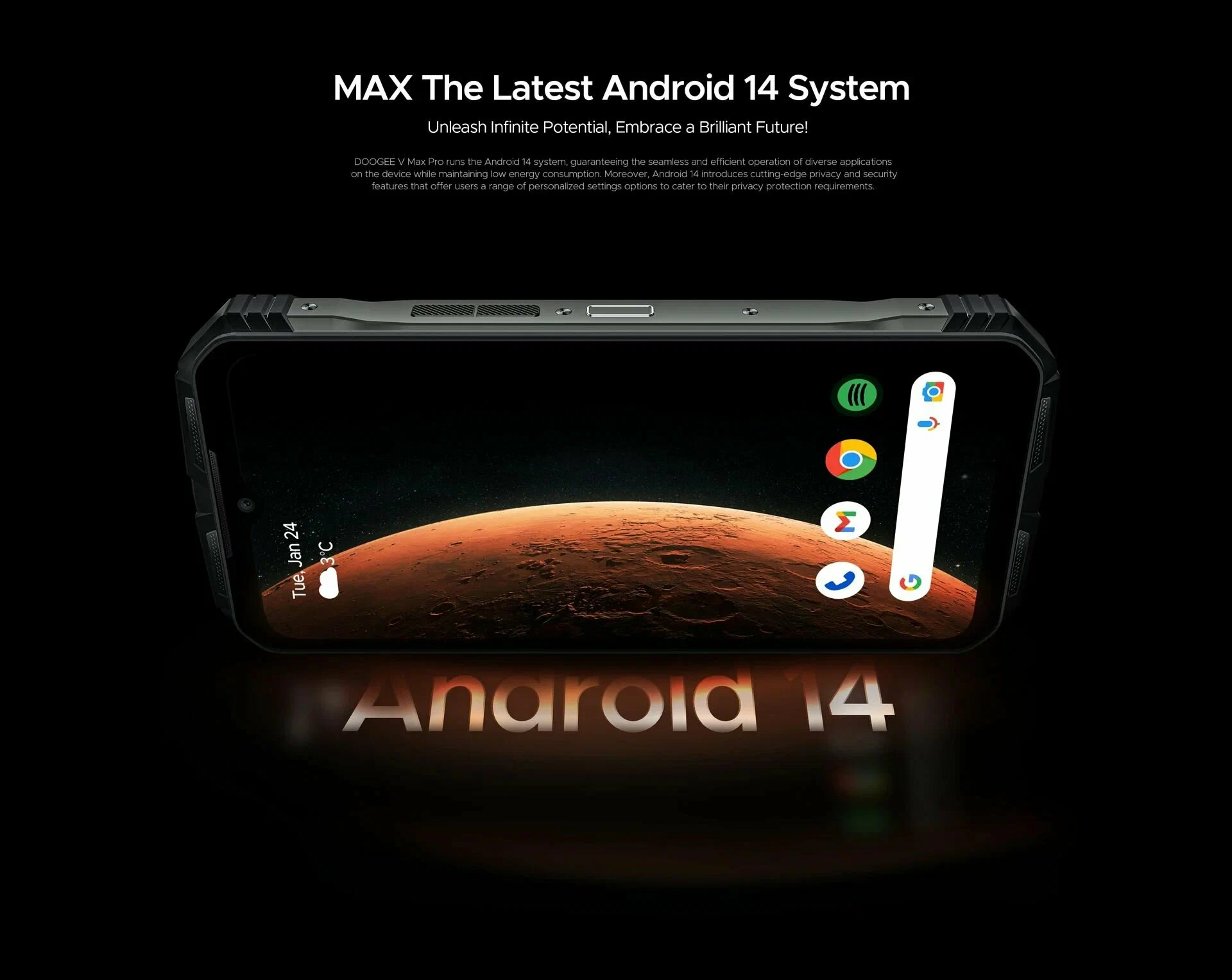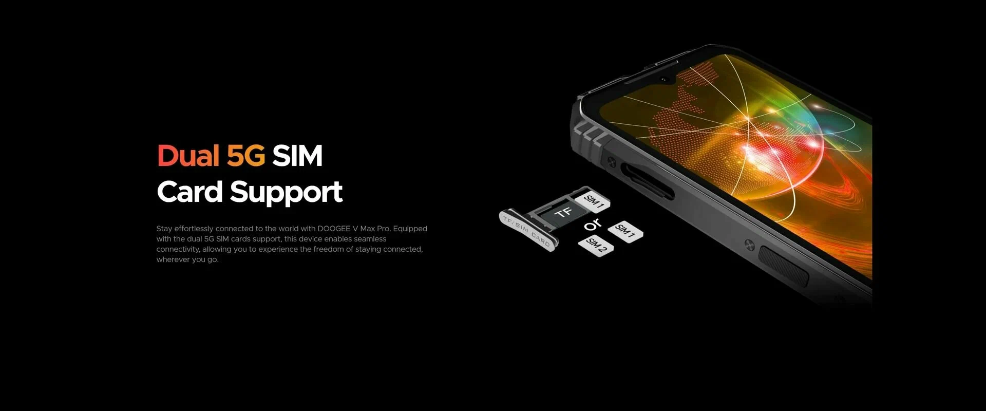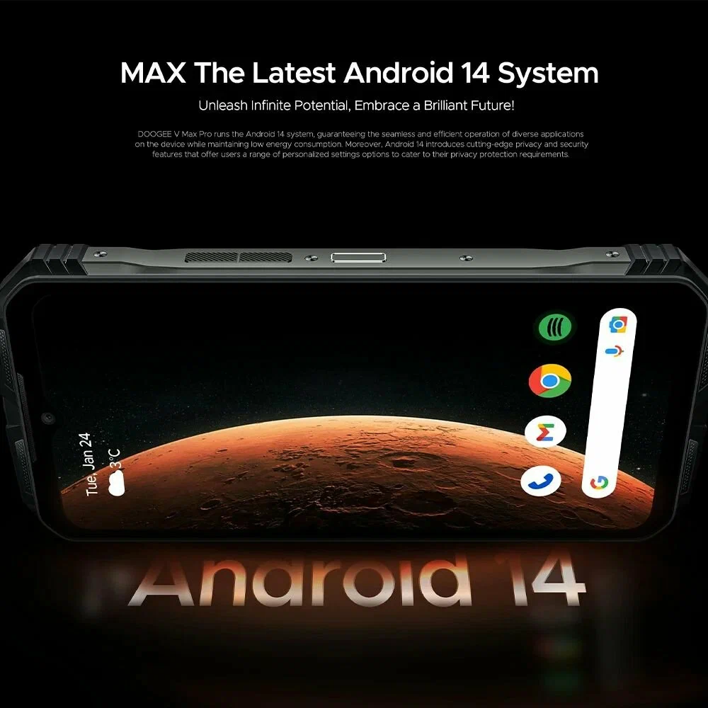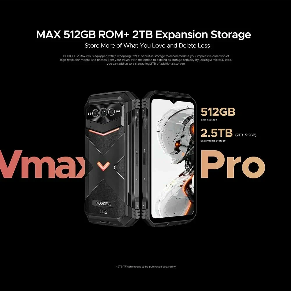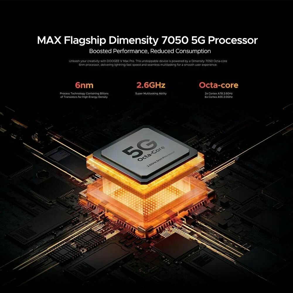 Doogee V Max Pro — это прочный и производительный смартфон, созданный для работы в экстремальных условиях. Он оснащен высокопроизводительным процессором, 512 ГБ памяти, мощным аккумулятором на 22 000 мА·ч и защитой по стандартам IP68/IP69K. Поддержка **NFC, 5G, быстрой зарядки 33 Вт и огромного объема памяти делают его отличным выбором для туристов, строителей, военных, охотников, рыбаков и всех, кто нуждается в надежном телефоне.