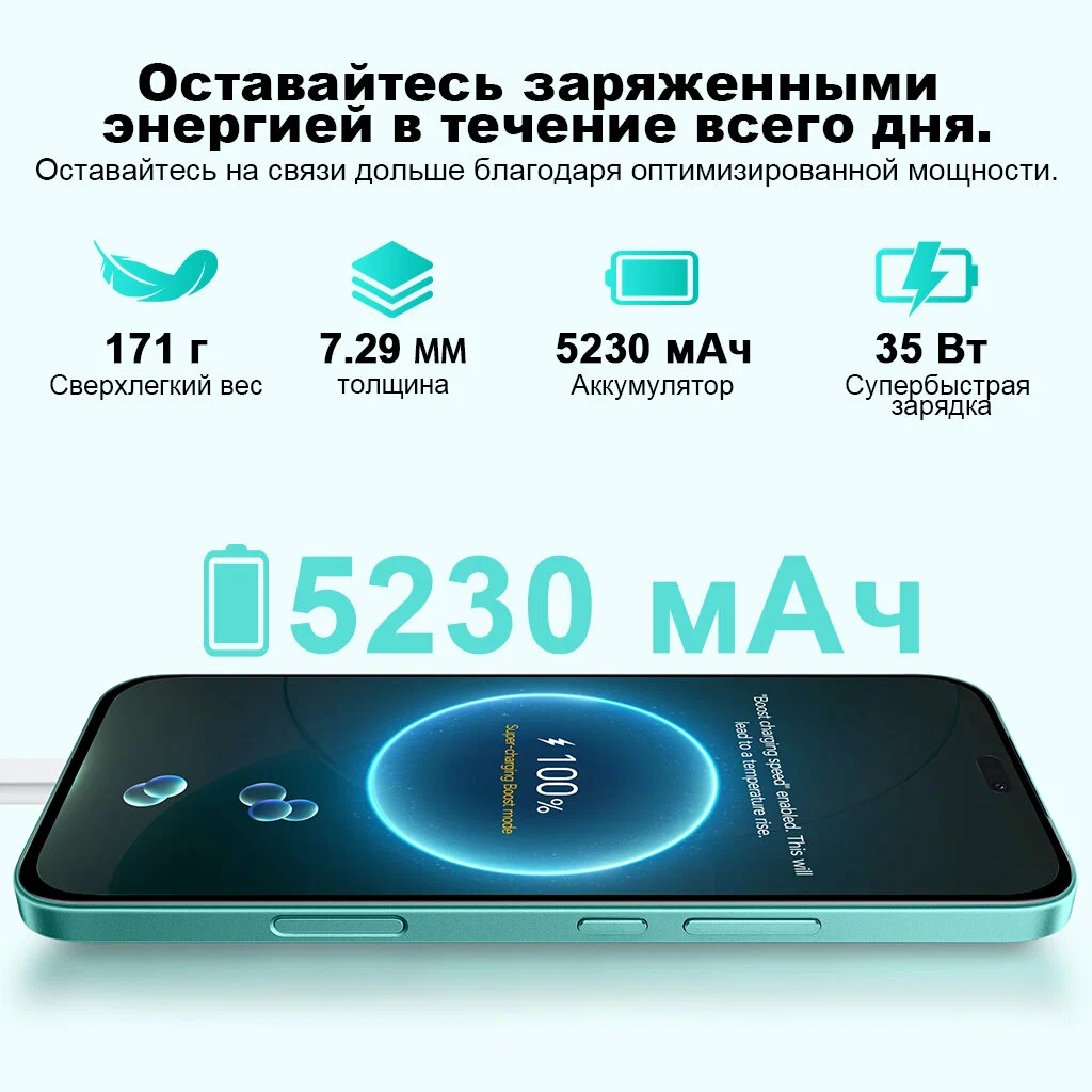 Смартфон имеет емкий аккумулятор на 5230 мАч, что обеспечивает длительное время работы без подзарядки. HONOR 400 Lite также поддерживает быструю зарядку мощностью 35 Вт, что позволяет быстро восстановить заряд батареи.