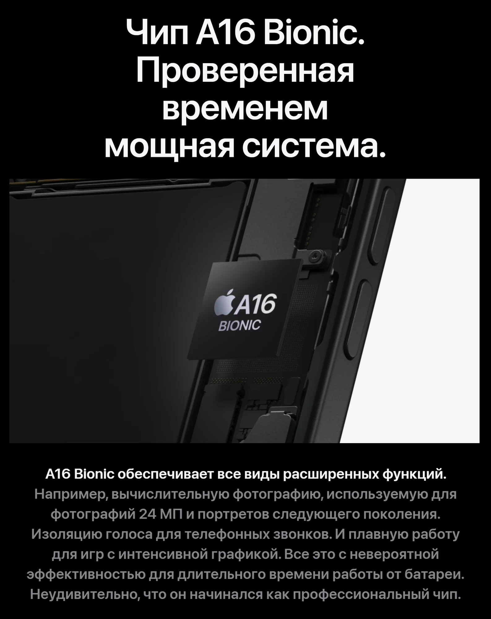 Новейший процессор A16 Bionic с усовершенствованным Neural Engine обеспечивает молниеносную скорость работы и плавность анимации, позволяя вам работать, играть и открывать новые горизонты без задержек и тормозов.