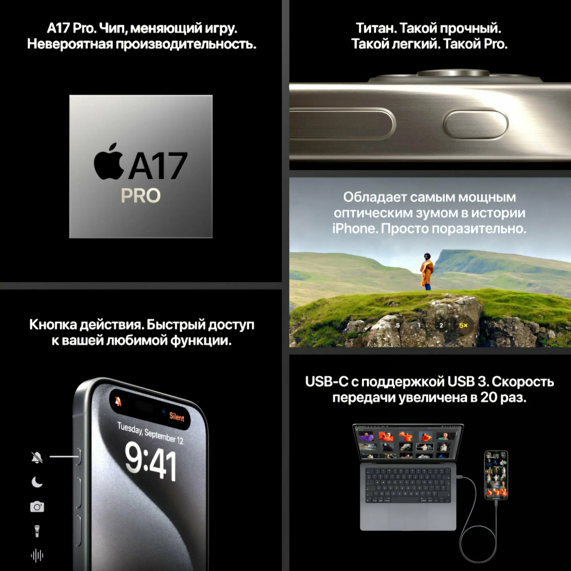 iPhone 15 Pro оснащен процессором Apple A17 Pro с частотой 3780 МГц и 6 ядрами. Объем оперативной памяти составляет 8 ГБ, что гарантирует быструю и плавную работу устройства. Встроенная память составляет 256 ГБ, что позволяет хранить большое количество данных.