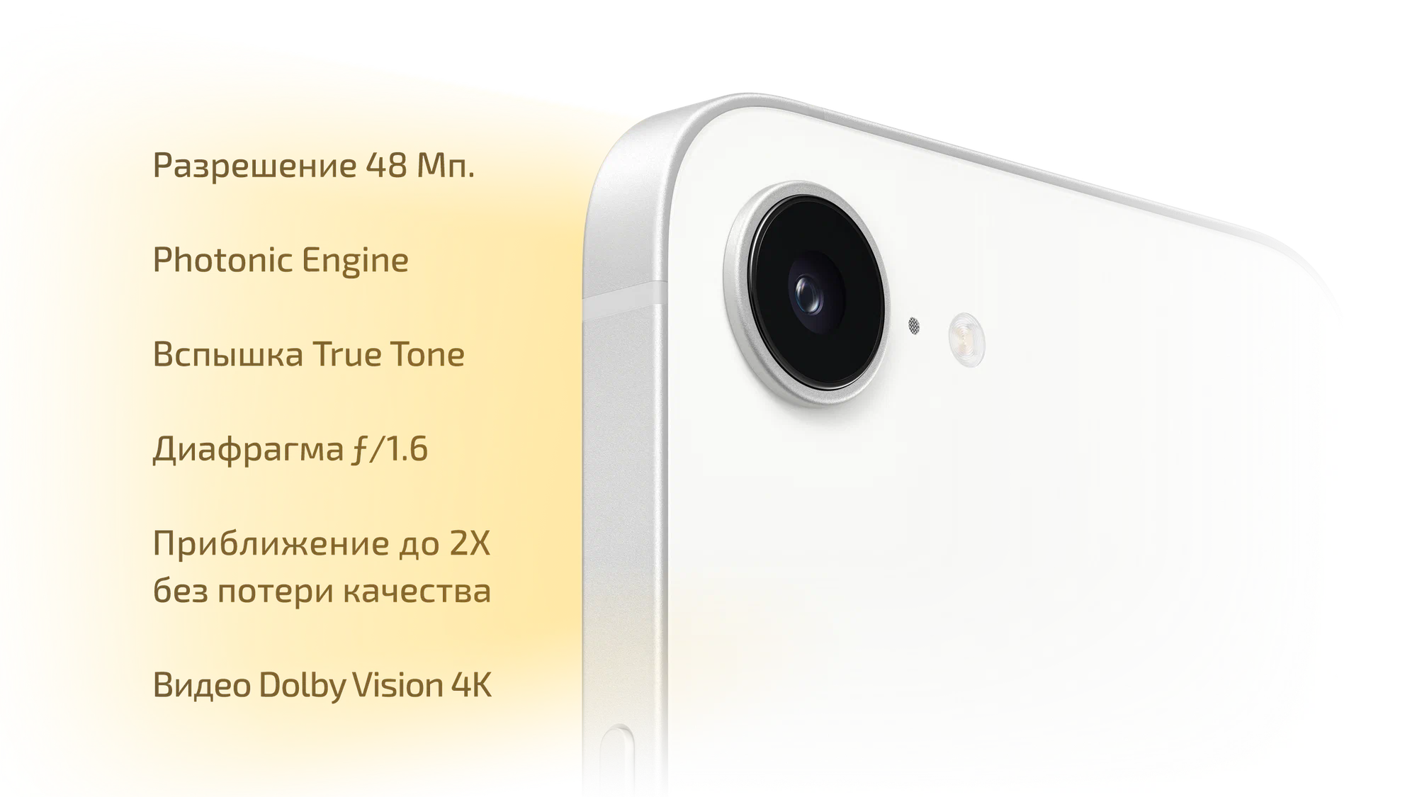 Смартфон оснащен тройной камерой с разрешением 48 Мп, которая позволяет снимать качественные фотографии и видео. iPhone 16e поддерживает запись видео в 4K при 60 к/с, а также имеет отличную стабилизацию и поддержку замедленной съемки.