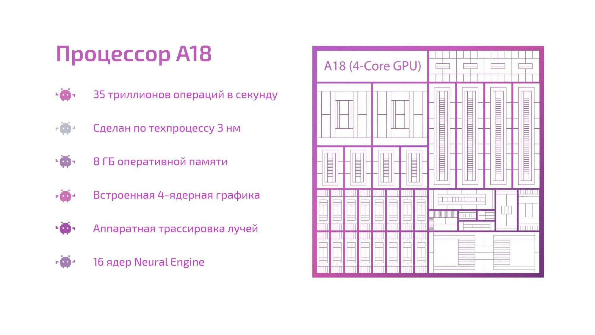 На борту установлен мощный чип A18 Pro, который сочетает в себе невероятную скорость и энергоэффективность. Встроенный накопитель объемом 512 ГБ обеспечивает огромное пространство для хранения файлов, медиаконтента и приложений. Усовершенствованная система охлаждения гарантирует стабильную работу устройства даже при интенсивных нагрузках.