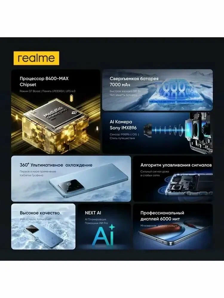 Смартфон Realme GT 7T — это мощное устройство, которое сочетает в себе стильный дизайн и высокую производительность. Его экран имеет размер 6.8 дюйма и разрешение FHD+, что обеспечивает отличную четкость изображения и широкие углы обзора.