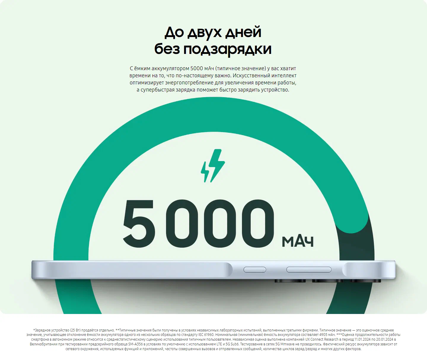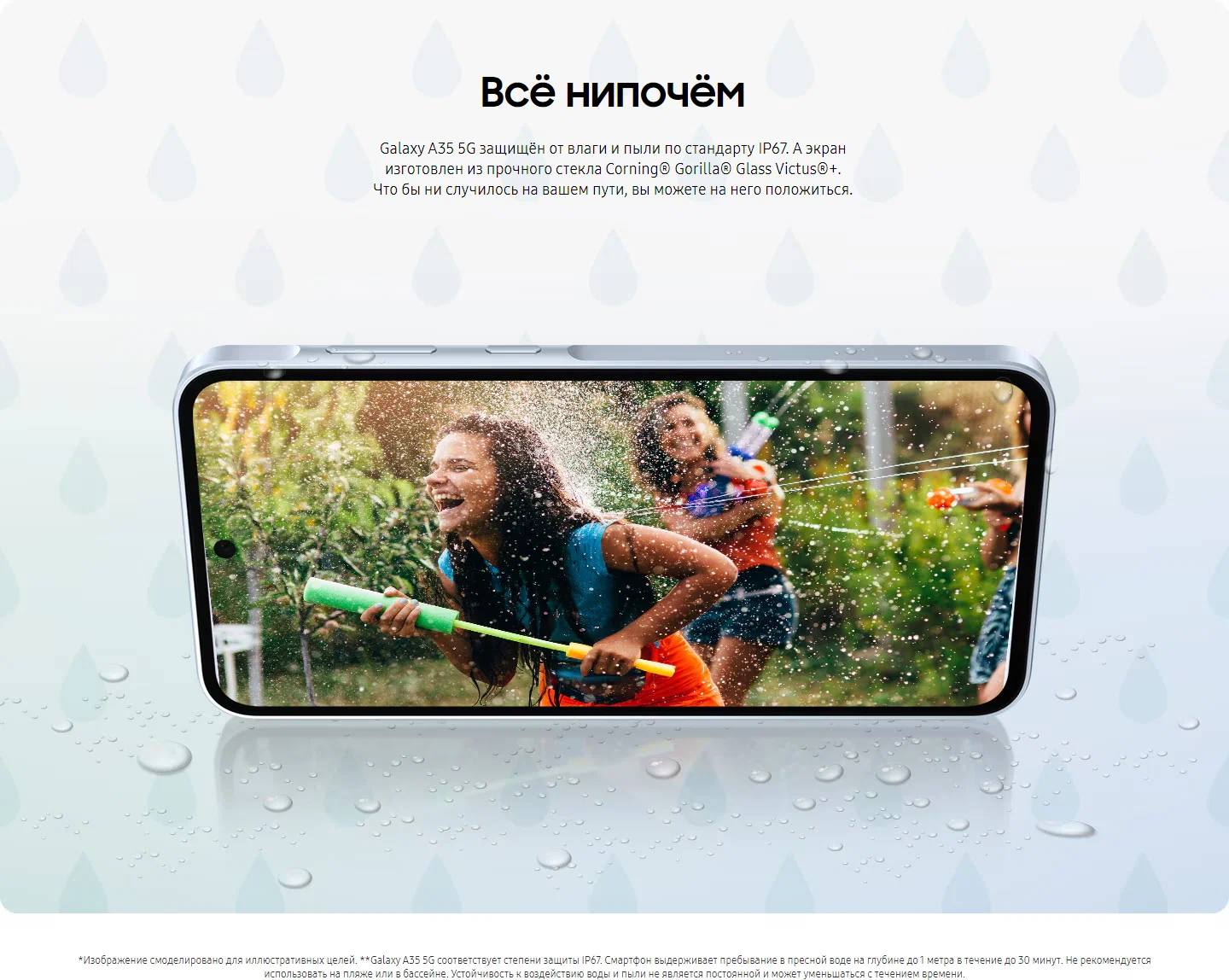 Смартфон Samsung Galaxy A35 5G 8/128 ГБ выполнен в голубом цвете, который подчеркнет ваш индивидуальный стиль и станет отличным дополнением к вашему образу. Благодаря качественному исполнению и материалам, этот смартфон будет служить вам долгое время, сохраняя свой первоначальный вид.