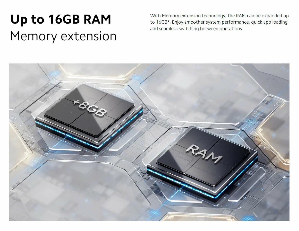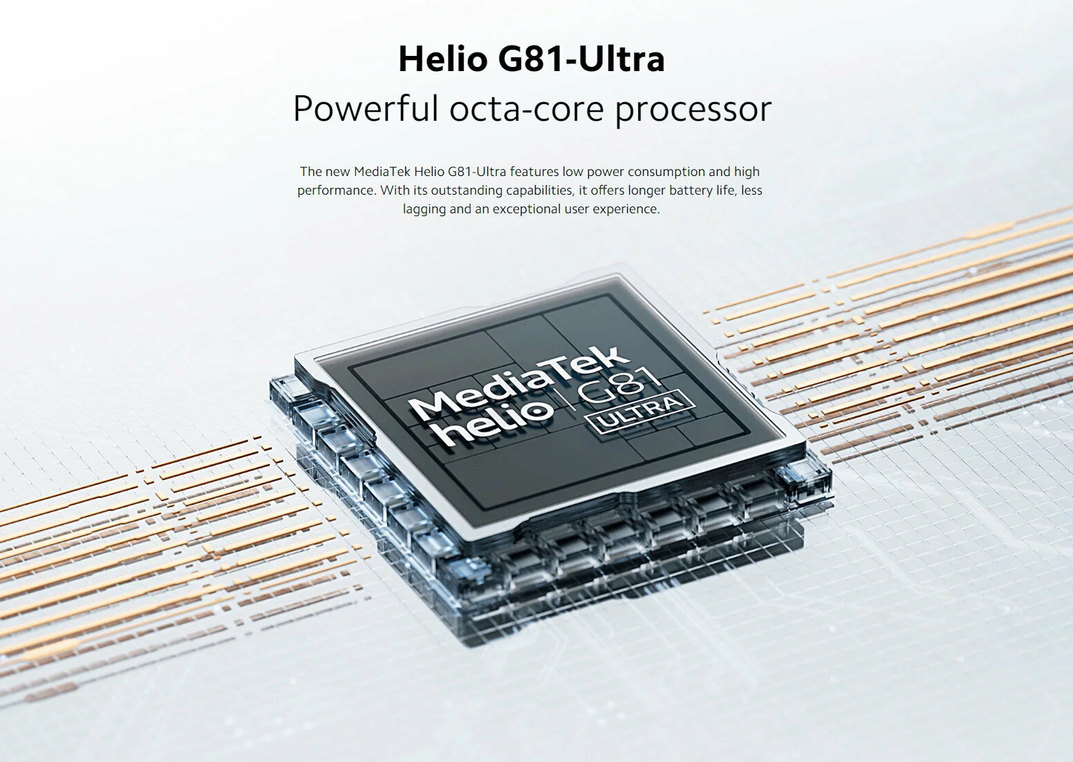 Мощный 8-ядерный процессор MediaTek Helio G81 Ultra с частотой 2000 МГц и 4 ГБ оперативной памяти гарантируют быструю и плавную работу даже при выполнении ресурсоемких задач.