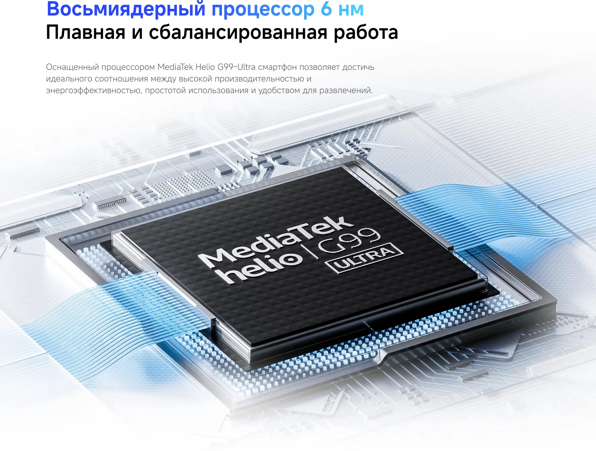Оснащённый процессором MediaTek Helio G99-Ultra, он обеспечивает идеальный баланс между высокой производительностью и энергоэффективностью, легко справляясь с повседневными задачами и вашими потребностями в развлечениях.